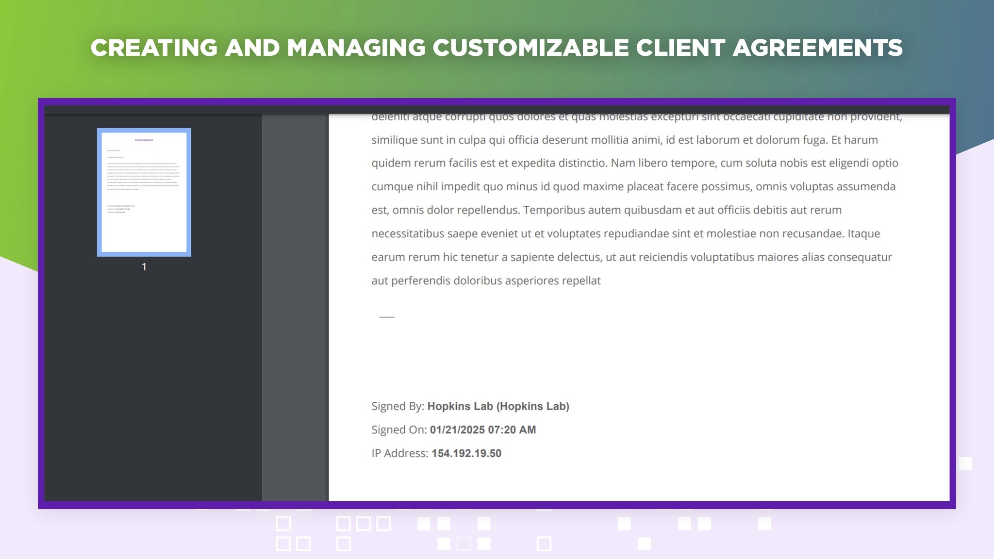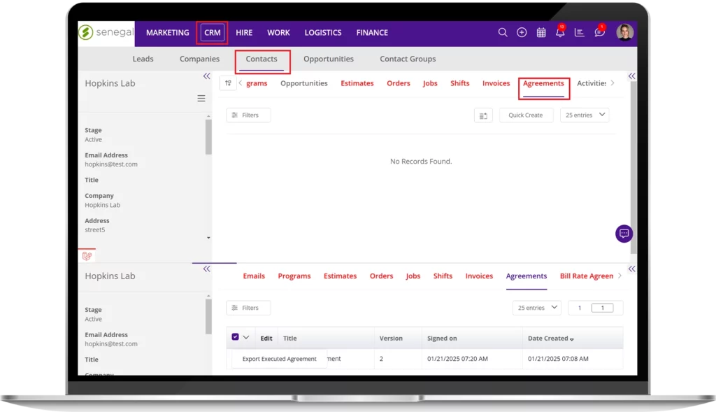 Client Agreements in Senegal Software are customizable templates for quick and easy client onboarding and document management. System administrators can create, edit, and format agreements via rich-editing tools under “CRM Settings.” These agreements can be saved as reusable templates and accessed within a contact’s profile. Users can personalize agreements by auto-populating client details and sending them for digital signatures directly. Once signed, the agreement status and data update automatically in the CRM, ensuring efficient contract management.