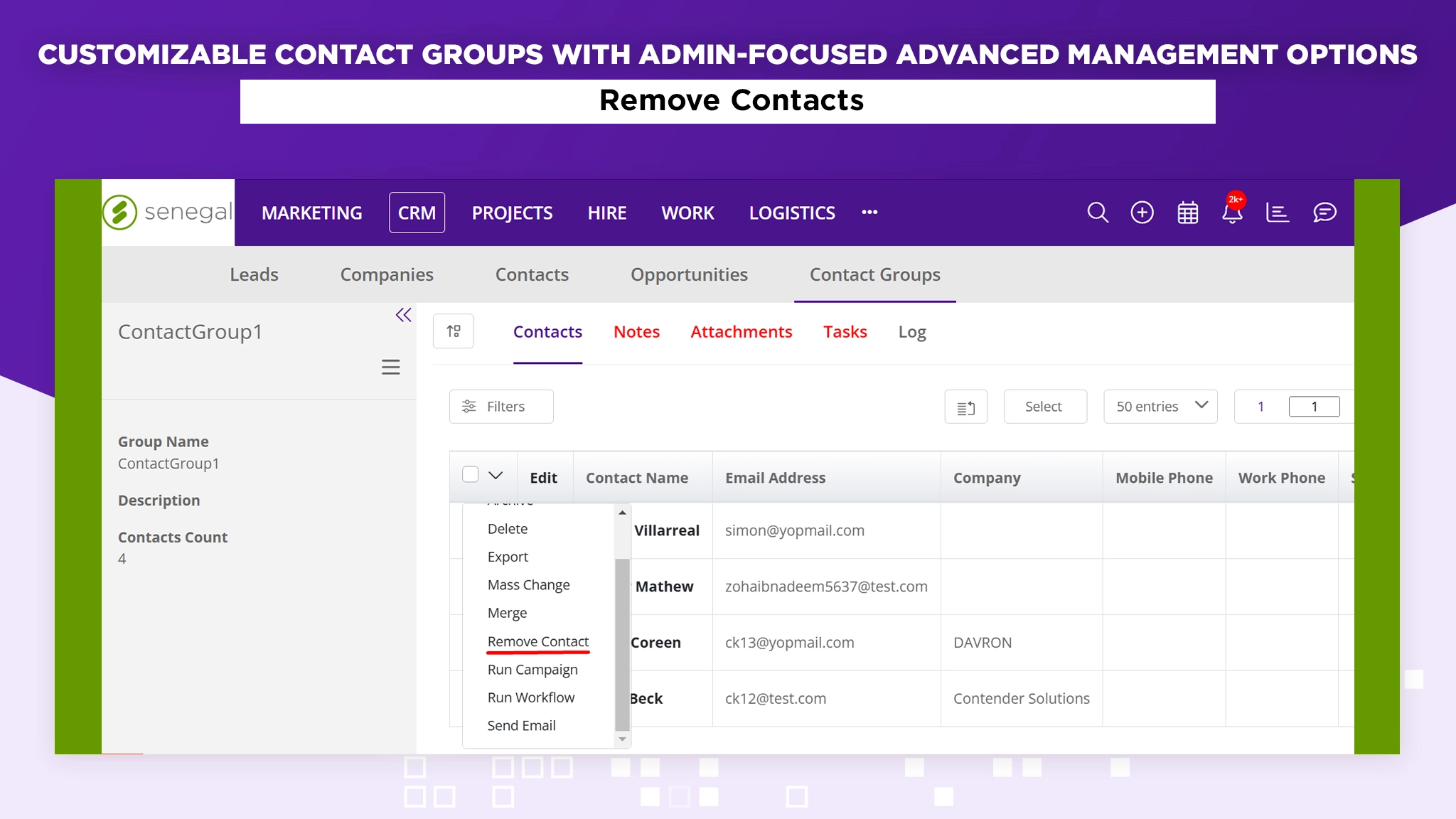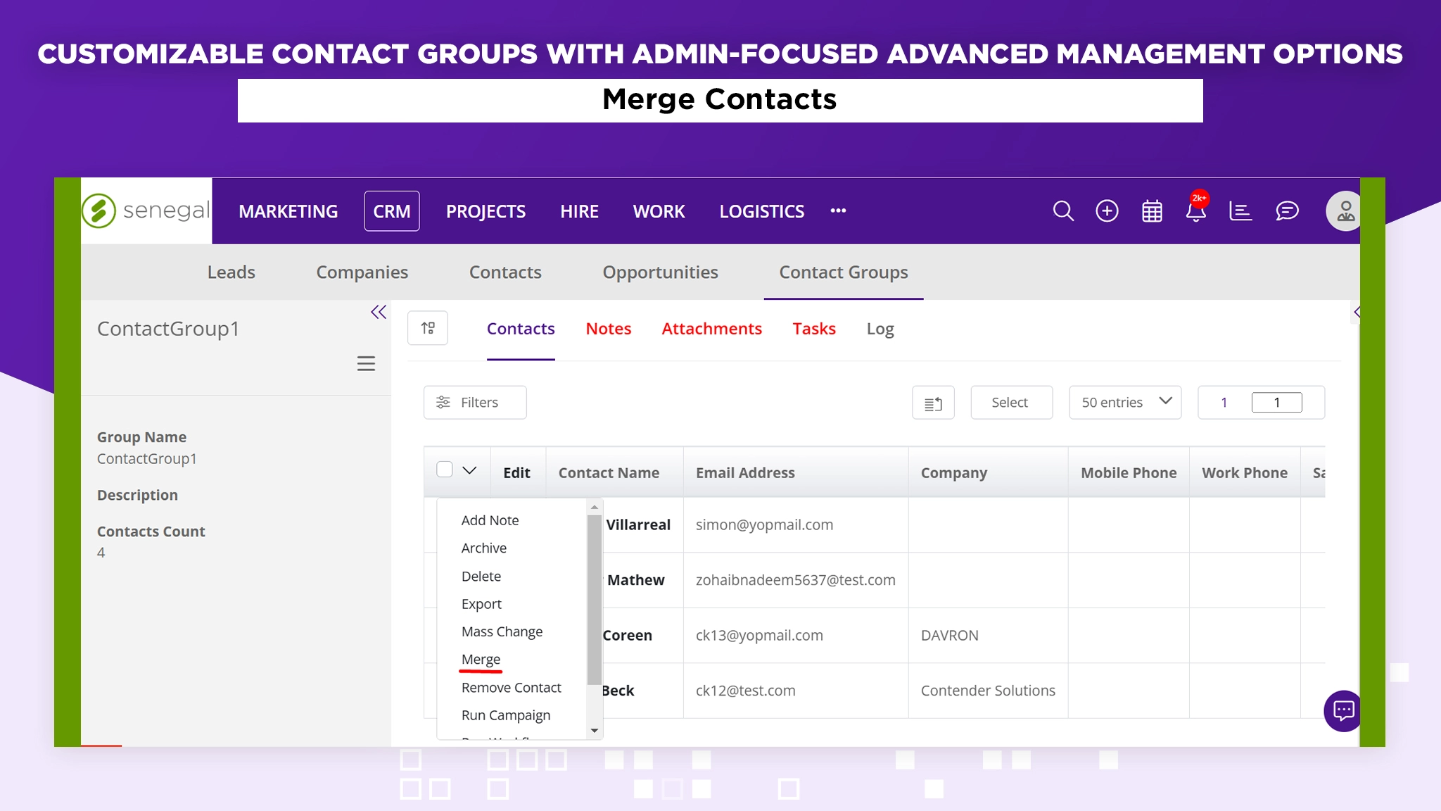 The Contact Groups feature in the Senegal Software CRM provides robust tools for organizing and managing contacts. Users can create groups by naming and describing them and then adding contacts using the “+” or “Create” button. In addition to standard contact editing features like adding notes, deleting, archiving, and exporting, the feature includes powerful options to streamline group actions. These advanced tools, alongside basic editing features, enhance contact organization and enable quick, effective contact management for CRM users.